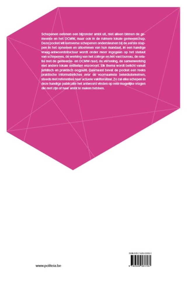 Schepenen oefenen een bijzonder ambt uit, niet alleen binnen de gemeente en het OCMW, maar ook in de ruimere lokale gemeenschap. Deze pocket wil kersverse schepenen ondersteunen bij de eerste stappen in het opnemen en uitoefenen van hun mandaat. In een handige vraag-antwoordstructuur wordt onder meer ingegaan op het statuut van schepenen, de werking van het college en het vast bureau, de relatie met de gemeente- en OCMW-raad, de verloning, de samenwerking met andere lokale entiteiten enzovoort. Elk thema wordt belicht vanuit juridisch en praktisch oogpunt. Daarnaast bevat de pocket een reeks praktische informatiefiches over de voornaamste beleidsdomeinen, steeds met referenties naar actuele vakliteratuur. Zo zal elke schepen in deze handige publicatie het antwoord vinden op vele mogelijke vragen die met zijn of haar ambt te maken hebben.