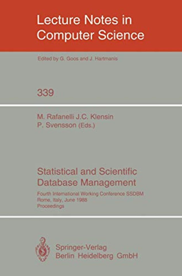 The Fourth International Working Conference on Statistical and Scientific Data Base Management (IV SSDBM) held on June 21-23, 1988 in Rome, Italy, continued the series of conferences initiated in California in December 1981. The purpose of this conference was to bring together database researchers, users and system builders, working in this specific field, to discuss the particular points of interest, to propose new solutions to the problems of the domain and to expand the topics of the previous conferences, both from the theoretical and from the applicational point of view. The papers of four scientific sessions dealt with the following topics: knowledge base and expert system, data model, natural language processing, query language, time performance, user interface, heterogeneous data classification, storage constraints, automatic drawing, ranges and trackers, and arithmetic coding. Two other special sessions presented work on progress papers on geographical data modelling, spatial database queries, user interface in an Object Oriented SDB, interpretation of queries, graphical query language and knowledge browsing front ends. The conference also had three invited papers on topics of particular interest such as "Temporal Data", "Statistical Data Management Requirements" and "Knowledge Based Decision Support Systems", included in this volume. The introductory paper by M. Rafanelli provides both an introduction to the general concepts helpful to people outside the field and a survey of all the papers in these Proceedings. Furthermore, there were three open panels. Papers by the chairmen, contributions of the panelists and a summary of the respective discussions are included in this volume, too.