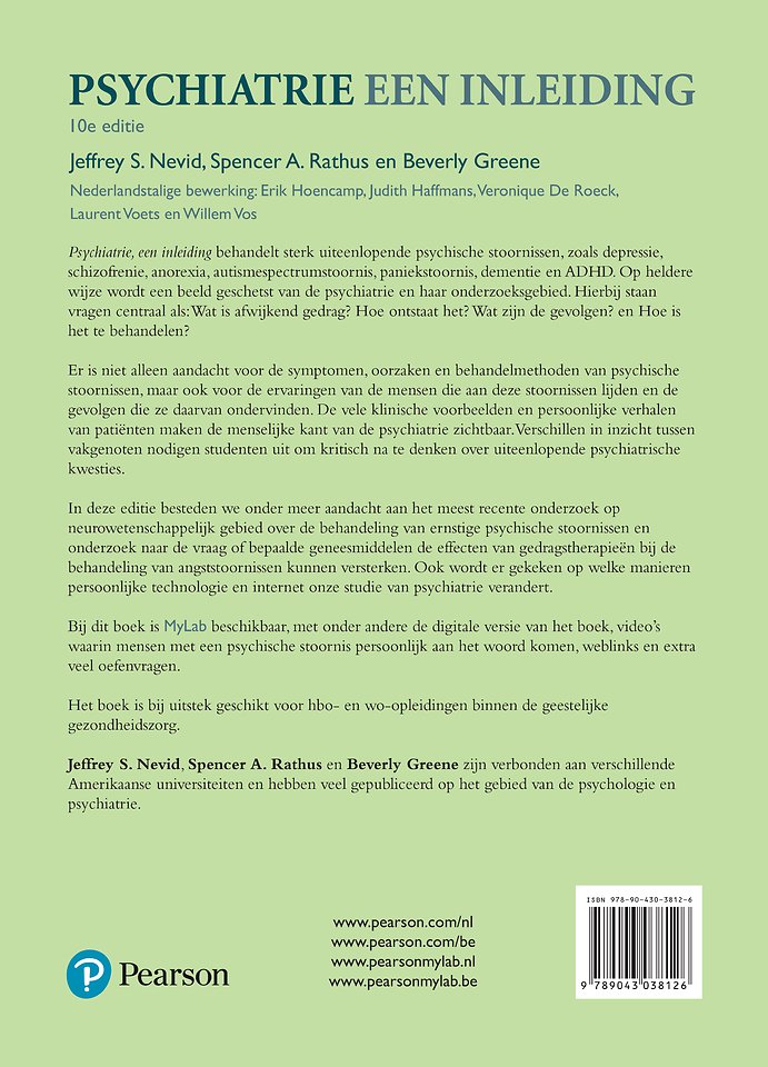 Psychiatrie, een inleiding behandelt sterk uiteenlopende psychische stoornissen, zoals depressie, schizofrenie, anorexia, autismespectrumstoornis, paniekstoornis, dementie en ADHD. Op heldere wijze wordt een beeld geschetst van de psychiatrie en haar onderzoeksgebied. Hierbij staan vragen centraal als: Wat is afwijkend gedrag? Hoe ontstaat het? Wat zijn de gevolgen? en Hoe is het te behandelen? Er is niet alleen aandacht voor de symptomen, oorzaken en behandelmethoden van psychische stoornissen, maar ook voor de ervaringen van de mensen die aan deze stoornissen lijden en de gevolgen die ze daarvan ondervinden. De vele klinische voorbeelden en persoonlijke verhalen van patiënten maken de menselijke kant van de psychiatrie zichtbaar. Verschillen in inzicht tussen vakgenoten nodigen studenten uit om kritisch na te denken over uiteenlopende psychiatrische kwesties. In deze editie besteden we onder meer aandacht aan het meest recente onderzoek op neurowetenschappelijk gebied over de behandeling van ernstige psychische stoornissen en onderzoek naar de vraag of bepaalde geneesmiddelen de effecten van gedragstherapieën bij de behandeling van angststoornissen kunnen versterken. Ook wordt er gekeken op welke manieren persoonlijke technologie en internet onze studie van psychiatrie verandert. Bij dit boek is MyLab beschikbaar, met onder andere de digitale versie van het boek, video’s waarin mensen met een psychische stoornis persoonlijk aan het woord komen, weblinks en extra veel oefenvragen. Het boek is bij uitstek geschikt voor hbo- en wo-opleidingen binnen de geestelijke gezondheidszorg. Bewerkers - Erik Hoencamp, psychiater, was werkzaam bij de Parnassia Groep en betrokken bij de opleiding van psychiaters. - Judith Haffmans, docent Biopsychopathologie en Psychofarmacologie aan de Universiteit Leiden. - Veronique de Roeck is onderzoeker en docent Psychiatrie aan de KU Leuven. - Laurent Voets was docent Psychiatrie aan de KU Leuven. Hij is nu met pensioen. - Willem Vos is docent Psychopathologie en Ontwikkelingspsychologie aan de Hanzehogeschool.