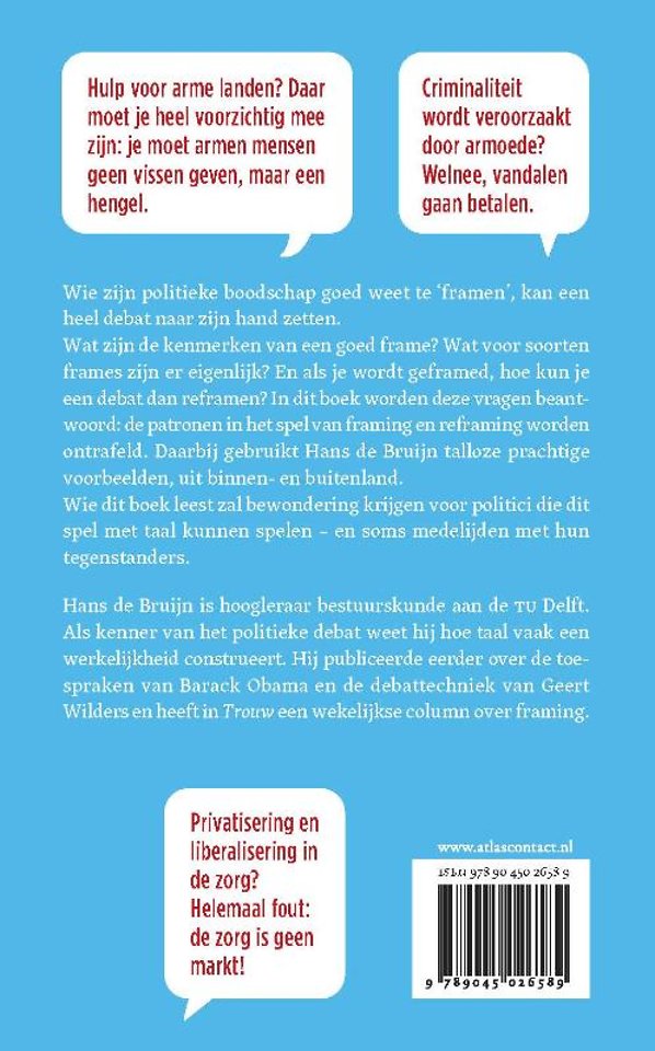 Wie zijn politieke boodschap intelligent kan verpakken, kan de werkelijkheid naar zijn hand zetten, zo laat Hans de Bruijn zien in dit vlijmscherpe boek. Hij legt uit hoe framing werkt en geeft een overzicht van de strategieën, met prachtige voorbeelden - de frames van Ronald Reagan en Bill Clinton, van Mark Rutte en Diederik Samsom, van Margeret Thatcher en Angela Merkel: ze komen allemaal voorbij. Framing is veel meer dan slim taalgebruik. Het gaat vaak om de vraag hoe je als politicus de essentie kunt verwoorden van waar je mee bezig bent - en dat is in onze samenleving een bittere noodzaak geworden.
