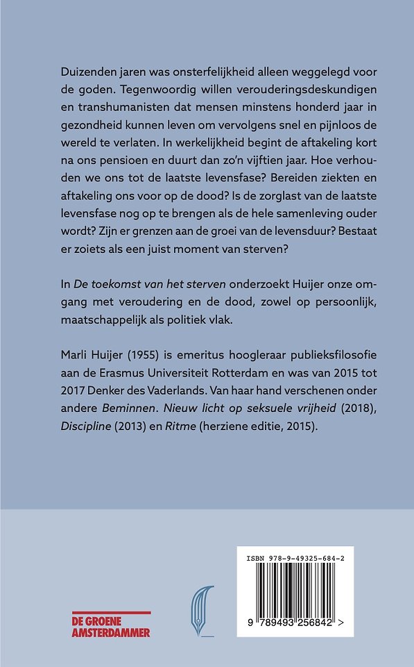 sterven dood sterfelijkheid levensduur ouderdom vergrijzing filosofie onsterfelijkheid transhumanisme geneeskunde toekomst levensverwachting juiste sterven zorg aftakeling ethiek veroudering maatschappij meaning zorgethiek politiek chronische ziekten autonomie medicalisering levenskunst duurzaamheid euthanasie verpleeghuizen palliatieve zorg lijden